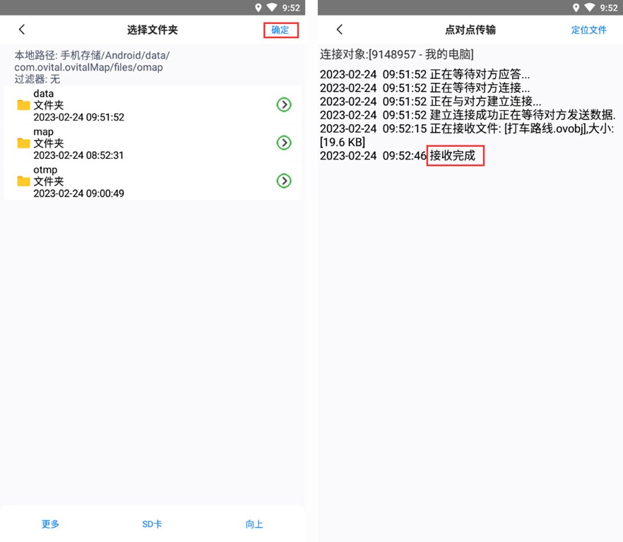 電腦端提示“是否確定接收地圖文件”,選擇存儲目錄,點擊【確定】,等待窗口提示“接收完成”。