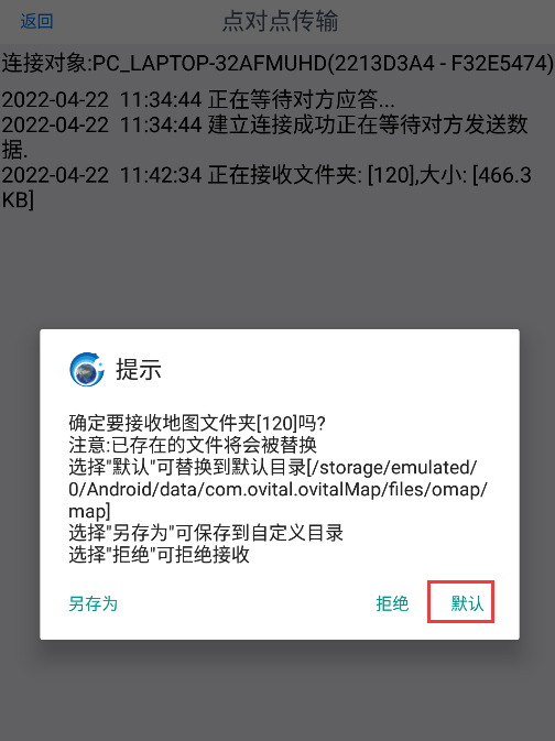 ③在手機(jī)端,提示“確定接收地圖文件夾嗎?”,選擇【默認(rèn)】,等待提示“接收完成”即可。