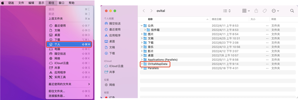 ②在macOS電腦端點擊【前往】→【個人】→【OvitalMapData】。